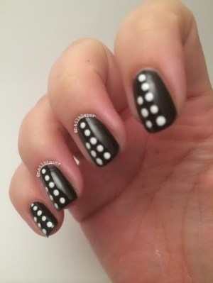 I started with two coats of OPI Lady in Black. Once dry, I used OPI Alpine Snow and a dotting tool to add the ‘buttons’.