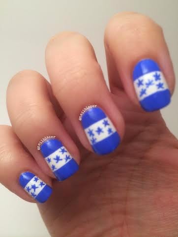 Once completely dry (COMPLETELY PEOPLE!), I used nail vinyls and Barry M Gelly Damson to create the blue stripes.