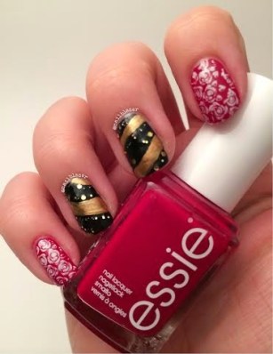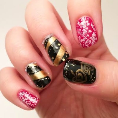 Paint your thumb and middle two fingers black, and add gold stripes. Using the toothpick or orange stick, pick out some pieces from your gold glitter polish and place them along the gold lines.