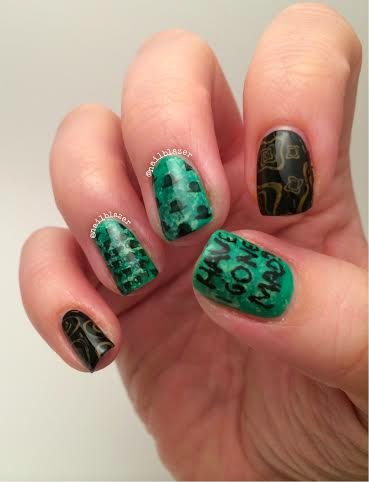 Use your stamping kit and plates to stamp the designs over the base colours and the nail art pen to write ‘HAVE I GONE MAD?’ onto the thumb.