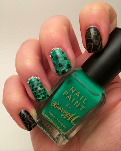 For the green nails, paint the middle shade of green (Barry M Spring Green) as the base, and use the ball of cling film to dab the other two shades over it to create a mottled effect.
