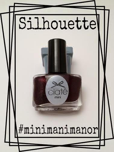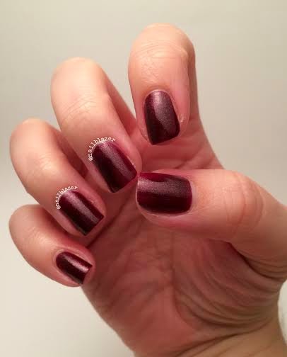 Behind Door #13 – Silhouette. This is an interesting one – in the bottle it looks like a chocolate brown shimmer, but on the nail it’s very much a burgundy red. Pictured below is two coats.