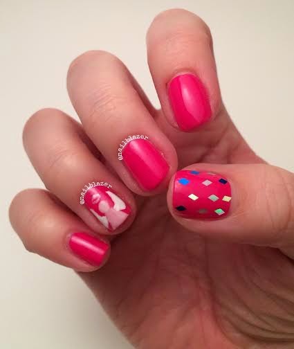 Two coats of Cupcake Queen formed the base of this design, followed by Amazing Gracie for the angel’s body and head. Her wings were painted with OPI Alpine Snow, and her halo was OPI Solitaire.
