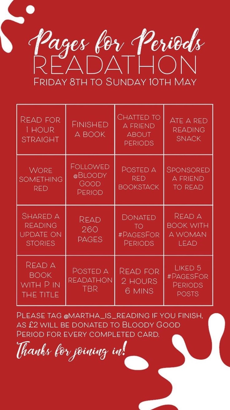 I’m conscious that not everyone can commit to the overall challenge, so we’ve come up with the Pages for Periods Readathon! This was the idea of one of my co-fundraisers Hayley (@hayleyjaynereads) and I am VERY excited π The idea is to read as much as you can over the bank holiday weekend and ideally raise or donate some money in the process! Here’s how you can get involved: